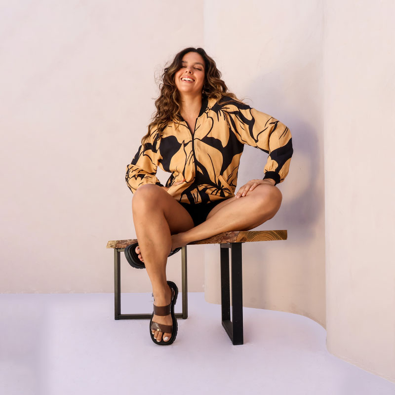 – O modelo mede 1,65m de altura e usa tamanho P na foto.