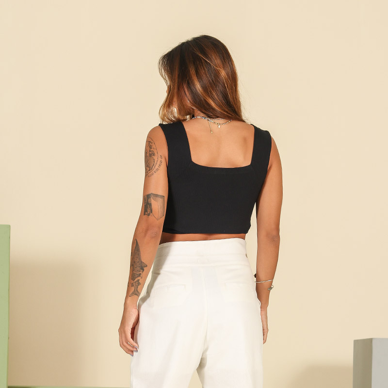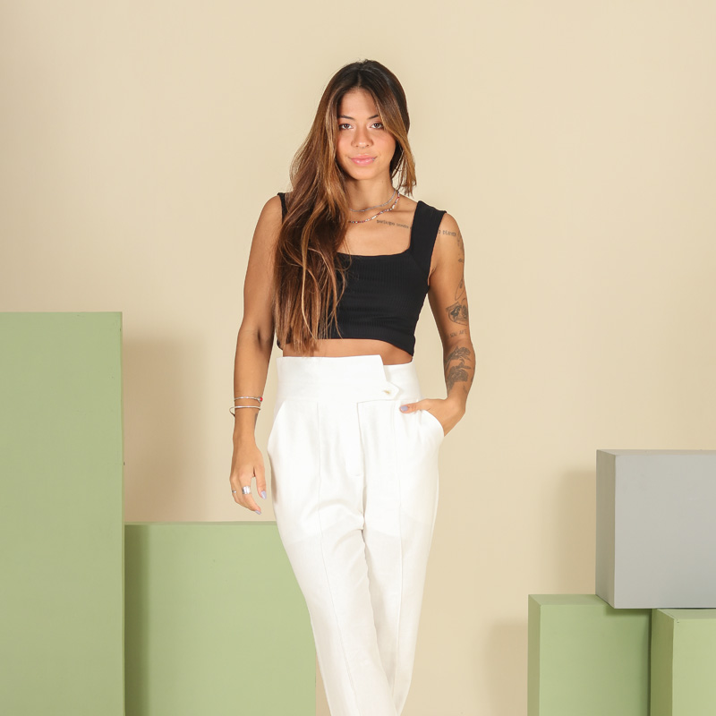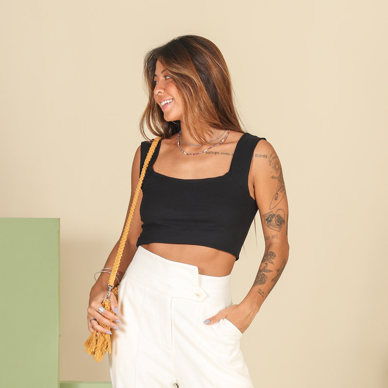 – O modelo mede 1,65m de altura e usa tamanho P na foto.