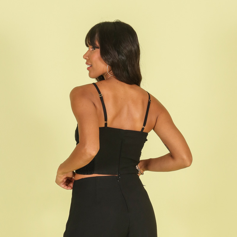 – O modelo mede 1,65m de altura e usa tamanho P na foto.