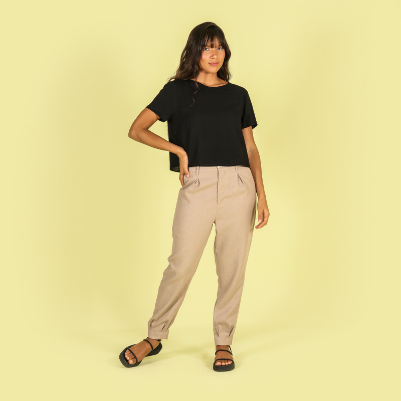 – O modelo mede 1,65m de altura e usa tamanho P na foto.