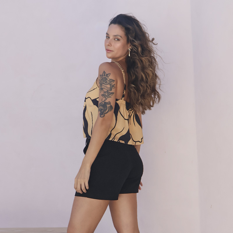 – O modelo mede 1,65m de altura e usa tamanho P na foto.